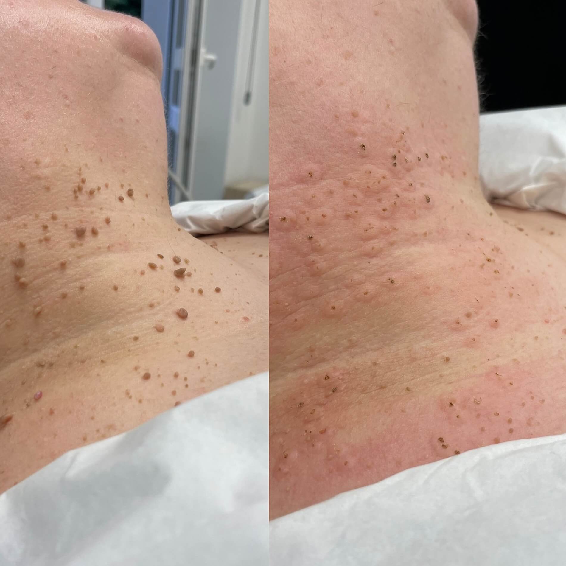 Włókniaki to łagodne zmiany skórne w formie miękkich narośli w kolorze skóry lub ciemniejsze, najczęściej okrągłe lub owalne. Mogą mieć one różne wielkości — od kilku milimetrów do kilku centymetrów średnicy. Te mniejsze zwykle nie rzucają się w oczy, jednak te nieco większe — bywają nieestetyczne i mogą przeszkadzać w codziennym funkcjonowaniu. Laser frakcyjny CO2 to sposób, dzięki któremu możemy pozbyć się takich zmian skórnych. Usuwanie włókniaków laserem polega na skierowaniu precyzyjnej wiązki światła na zmianę skórną. Energia lasera powoduje odparowanie tkanki włókniaka, bez naruszenia zdrowej skóry wokół. Dzięki temu zabieg jest bardzo dokładny i minimalnie inwazyjny.