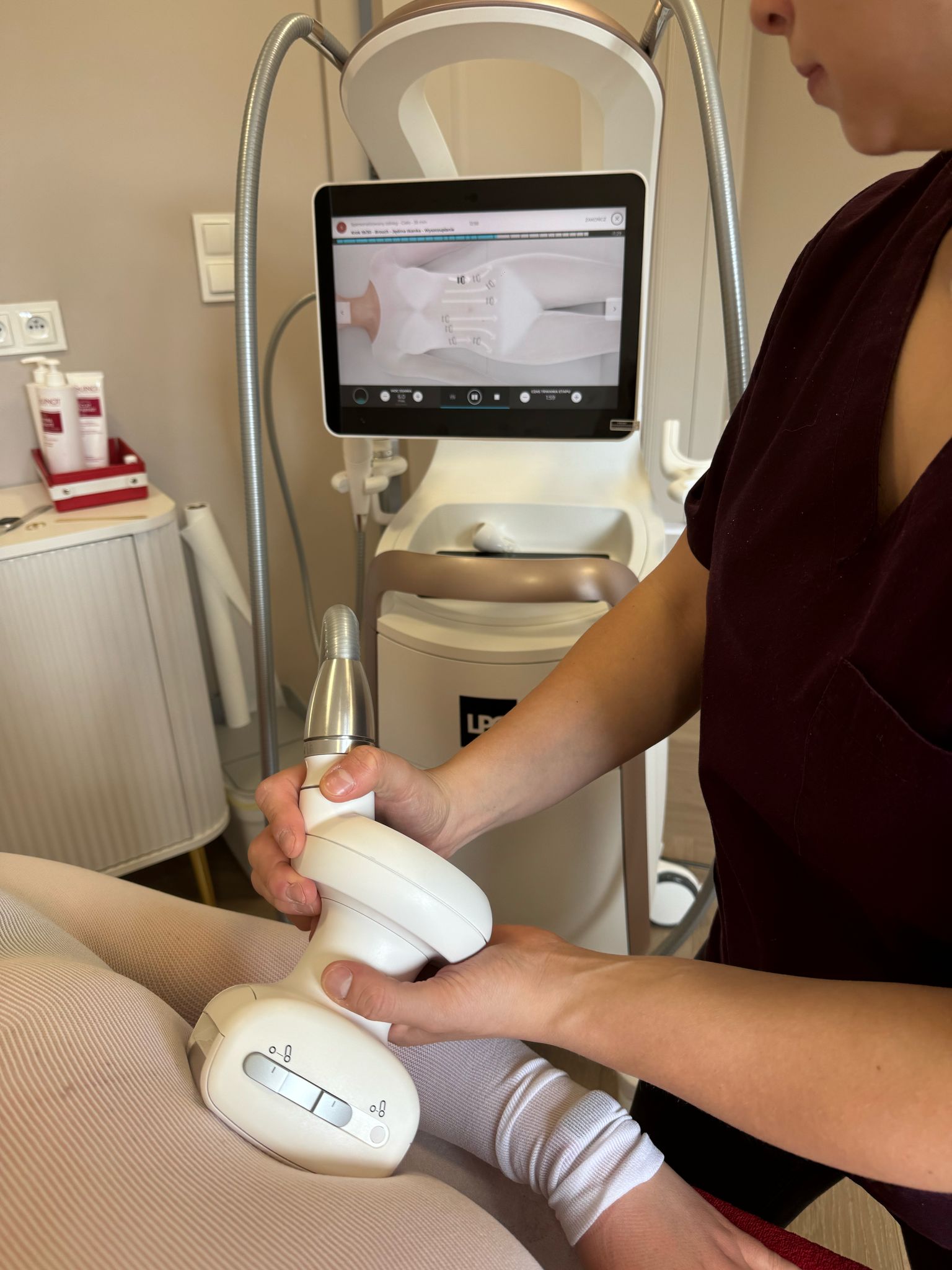 - Terapeuta prowadzi urządzenie po ciele – głowica z rolkami i podciśnieniem zasysa fałd skórny i wykonuje masaż tkanek.